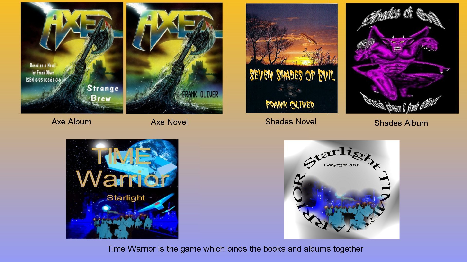 This site was created to support the Novels 'Axe' and 'Shades of Evil'. Each novel had its own album and both stories came together in the adventure, (click here>) 'Time Warrior'. The idea being to create an adventure experience. You can travel around the land in full landscape or in a windowed landscape with mouse/icon control or as in the days of old the game can be controlled soley by typing. It is an Amiga game though it can be run under emulation on a PC.